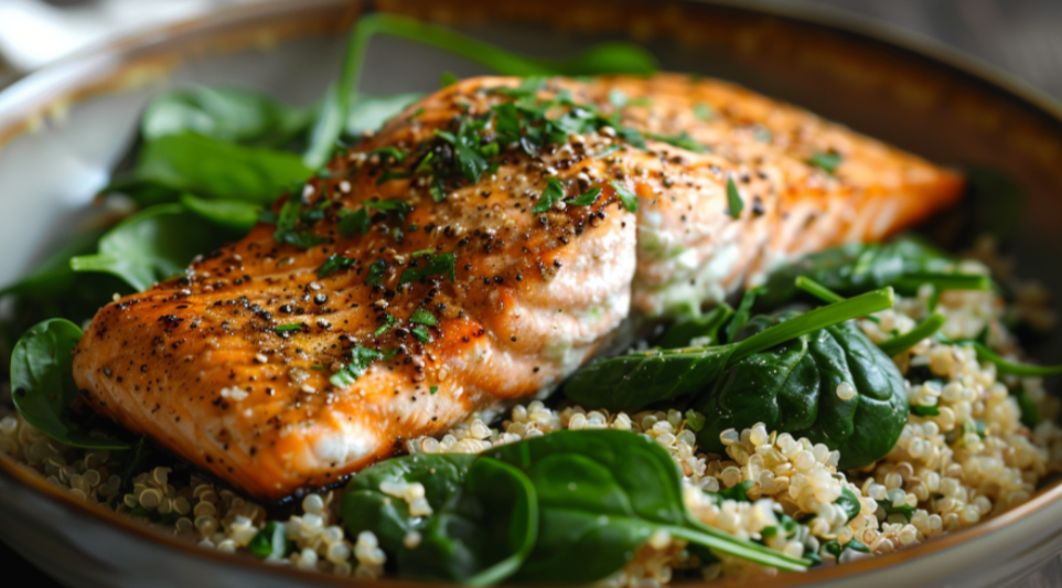 - Лосось с киноа и шпинатом: запеченный лосось приправляют лимонным соком, подают с отварной киноа и обжаренным шпинатом с чесноком, создавая гармоничное сочетание вкусов и пользы.