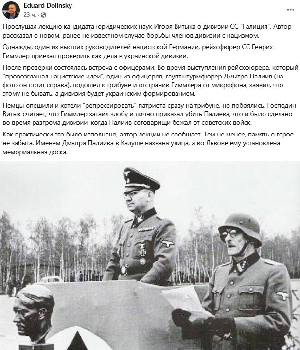 "Однажды, один из высших руководителей нацистской Германии, рейхсфюрер СС Генрих Гиммлер приехал проверить как дела в украинской дивизии. После проверки состоялась встреча с офицерами. Во время выступления рейсхфюрера, который "провозглашал нацистские идеи", один из офицеров, гауптштурмфюрер Дмытро Палиив (на фото он стоит справа), подошел к трибуне и отстранив Гиммлера от микрофона, заявил, что этому не бывать, а дивизия будет украинским формированием. Немцы опешили и хотели "репрессировать" патриота сразу на трибуне, но побоялись. Господин Витык считает, что Гиммлер затаил злобу и лично приказал убить Палиева, что и было сделано во время разгрома дивизии, когда Палиив сотоварищи бежал от советских войск", — написал он.